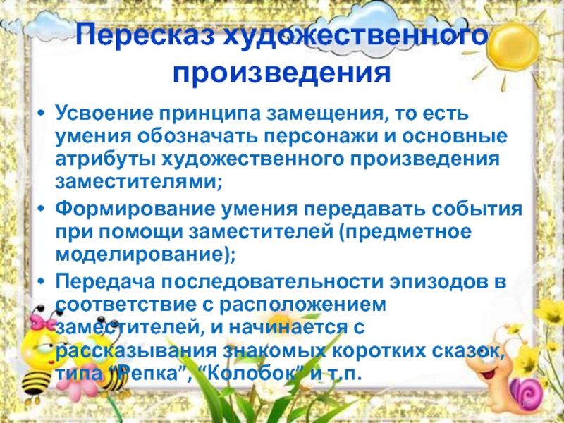 Передача последовательности эпизодов в соответствие с расположением заместителей, и начинается с рассказывания знакомых коротких сказок, типа “Репка”, “Колобок” и т.п.