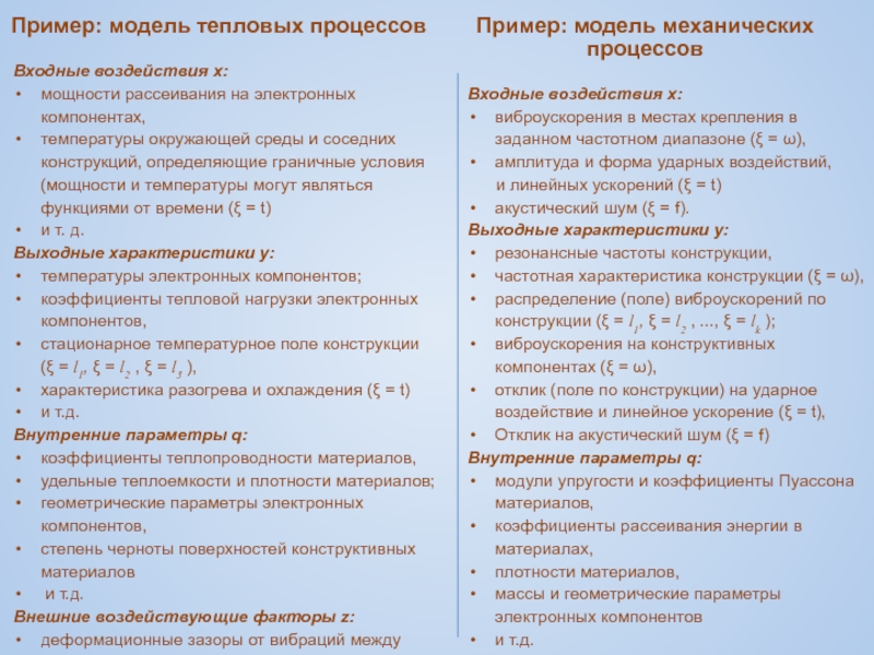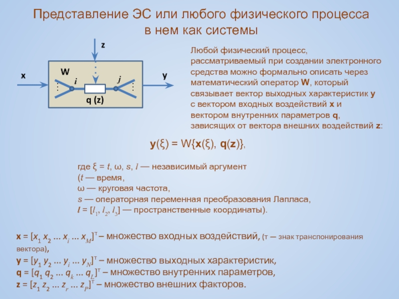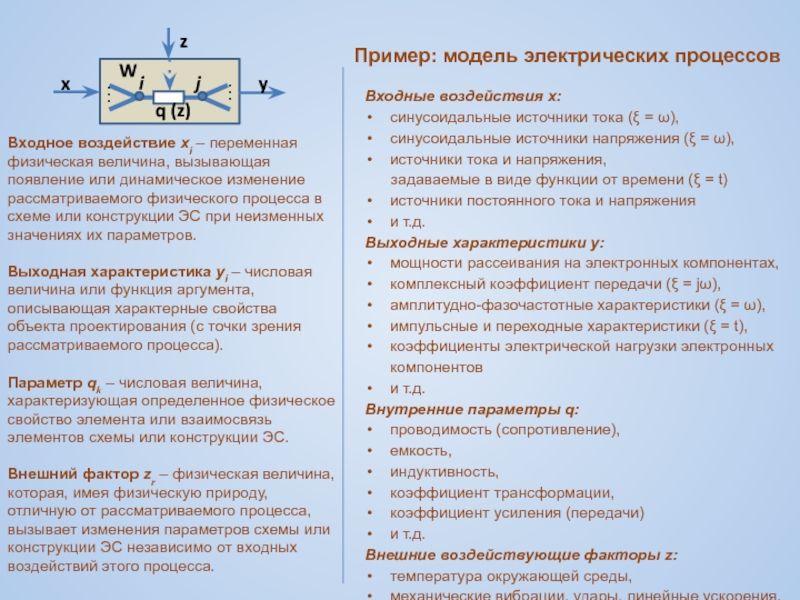 Внешний фактор zr – физическая величина, которая, имея физическую природу, отличную от рассматриваемого процесса, вызывает изменения параметров схемы или конструкции ЭС независимо от входных воздействий этого процесса.