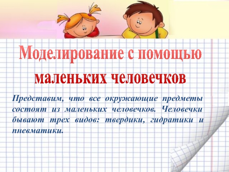 Моделирование с помощьюмаленьких человечковПредставим, что все окружающие предметы состоят из маленьких человечков. Человечки бывают трех видов: твердики,