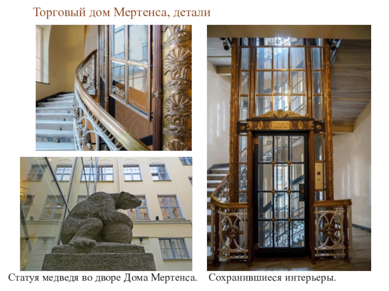 Слайд 18Статуя медведя во дворе Дома Мертенса. Сохранившиеся интерьеры.
