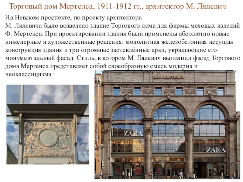 здания были применены абсолютно новые инженерные и художественные решения: монолитная железобетонная несущая конструкция здания и три огромные застеклённые арки, украшающие его монументальный фасад. Стиль, в котором М. Лялевич выполнил фасад Торгового дома Мертенса представляет собой своеобразную смесь модерна и неоклассицизма..