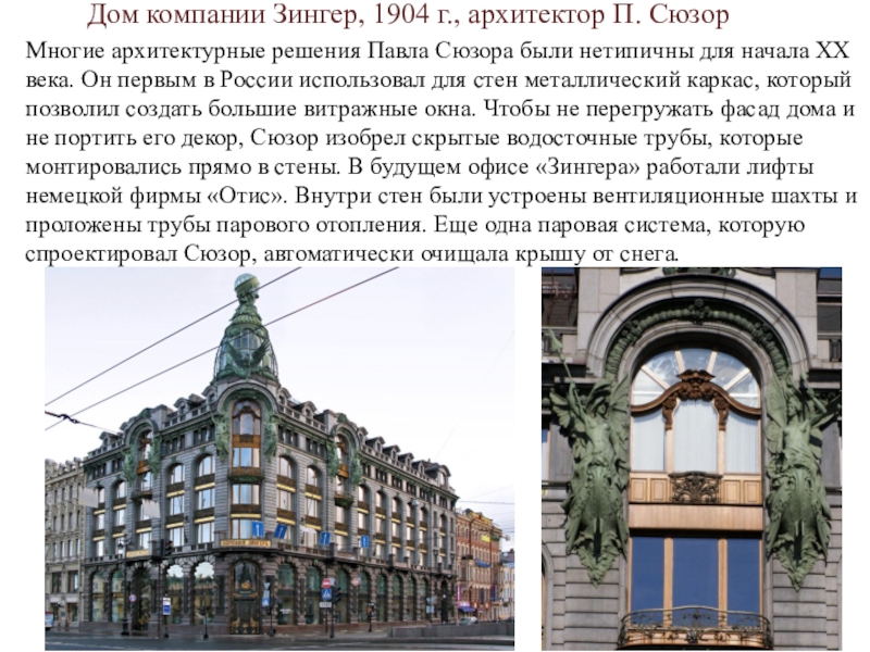 который позволил создать большие витражные окна. Чтобы не перегружать фасад дома и не портить его декор, Сюзор изобрел скрытые водосточные трубы, которые монтировались прямо в стены. В будущем офисе «Зингера» работали лифты немецкой фирмы «Отис». Внутри стен были устроены вентиляционные шахты и проложены трубы парового отопления. Еще одна паровая система, которую спроектировал Сюзор, автоматически очищала крышу от снега.