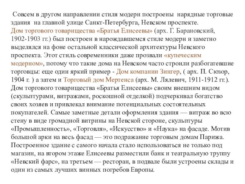 «Братья Елисеевы» (арх. Г. Барановский, 1902-1903 гг.) был построен в нарождавшемся стиле модерн и заметно выделялся на фоне остальной классической архитектуры Невского проспекта. Этот стиль современники даже прозвали «купеческим модерном», потому что такие дома на Невском часто строили разбогатевшие торговцы: еще один яркий пример - Дом компании Зингер, ( арх. П. Сюзор, 1904 г. ) а затем и Торговый дом Мертенса (арх. М. Лялевич, 1911-1912 гг.).