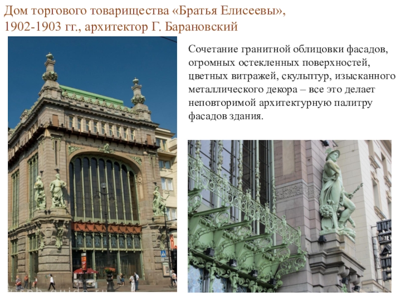 Слайд 13Дом торгового товарищества «Братья Елисеевы», 1902-1903 гг., архитектор Г. Барановский