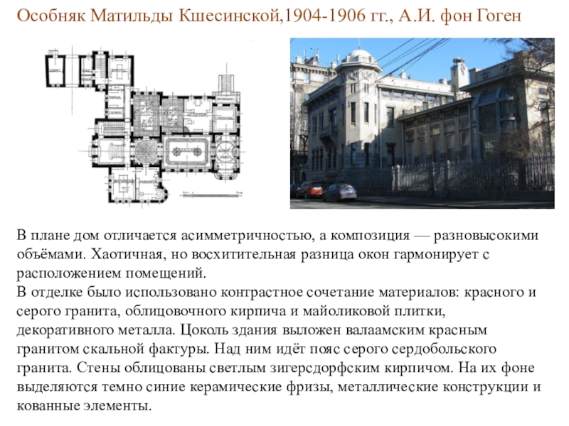 Слайд 19Особняк Матильды Кшесинской,1904-1906 гг., А.И. фон Гоген