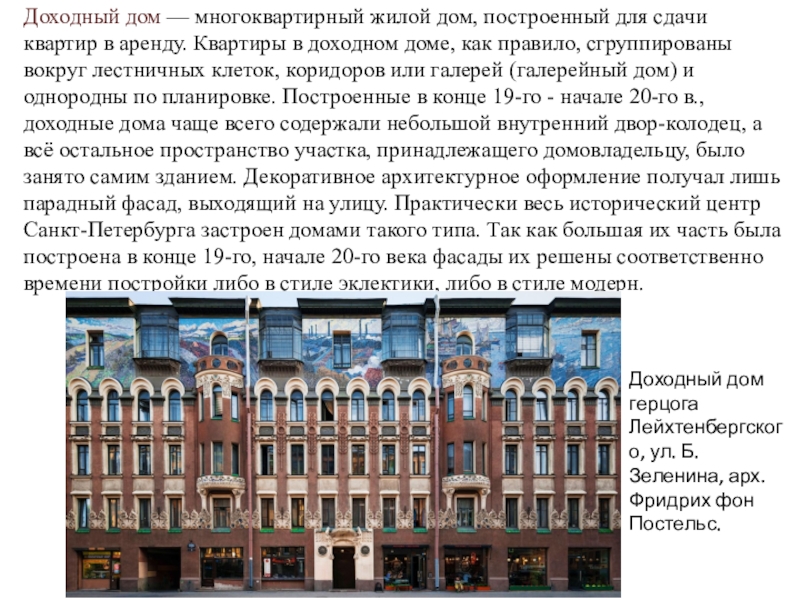 Слайд 21Доходный дом — многоквартирный жилой дом, построенный для сдачи квартир в