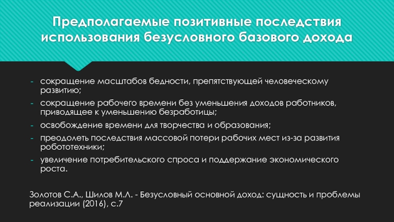 Слайд 30Предполагаемые позитивные последствия использования безусловного базового дохода