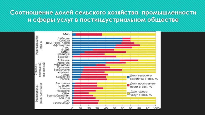 Слайд 23Соотношение долей сельского хозяйства, промышленности и сферы услуг в постиндустриальном