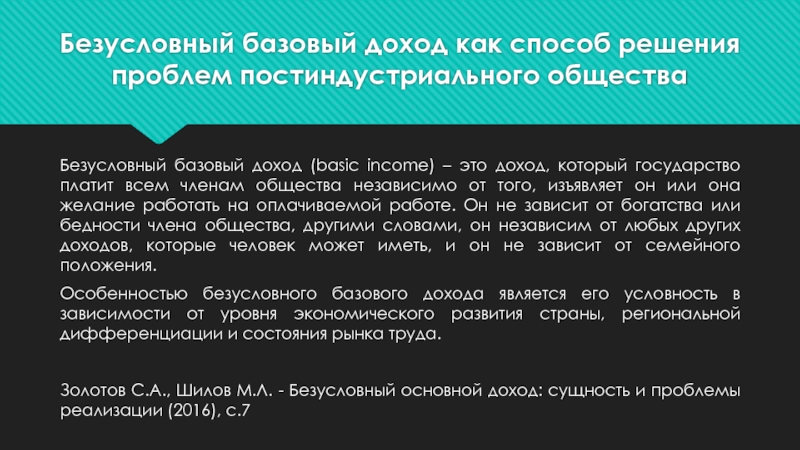 Слайд 28Безусловный базовый доход как способ решения проблем постиндустриального общества