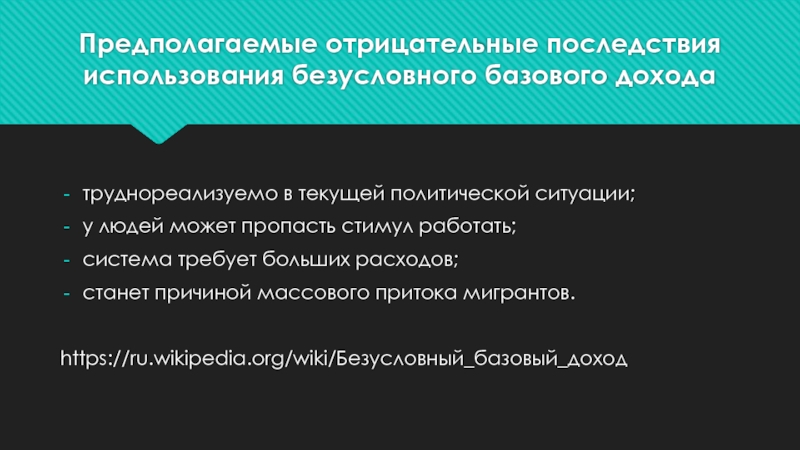 Слайд 31Предполагаемые отрицательные последствия использования безусловного базового дохода