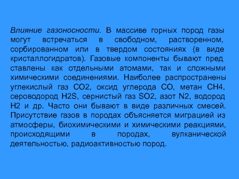 Слайд 6Влияние газоносности. В массиве горных пород газы могут встречаться в