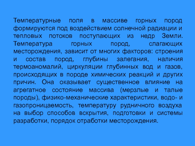 пород, слагающих месторождения, зависит от многих факторов: строения и состав пород, глубины залегания, наличия термоаномалий, циркуляции глубинных вод и газов, происходящих в породе химических реакций и других причин. Она оказывает существенное влияние на агрегатное состояние массива (мерзлые и талые породы), физико-механические характеристики, водо- и газопроницаемость, температуру рудничного воздуха на выбор способов вскрытия, подготовки и системы разработки, порядок отработки месторождения.
