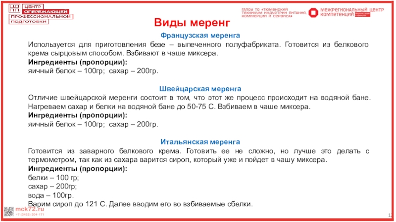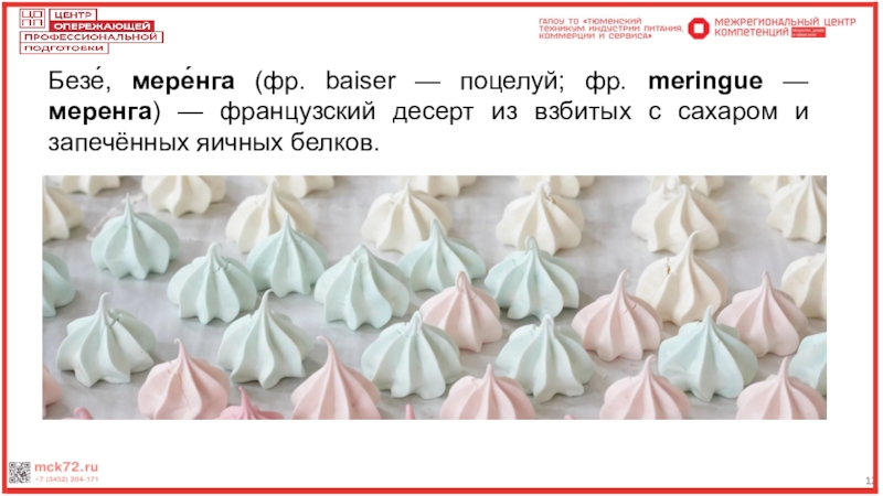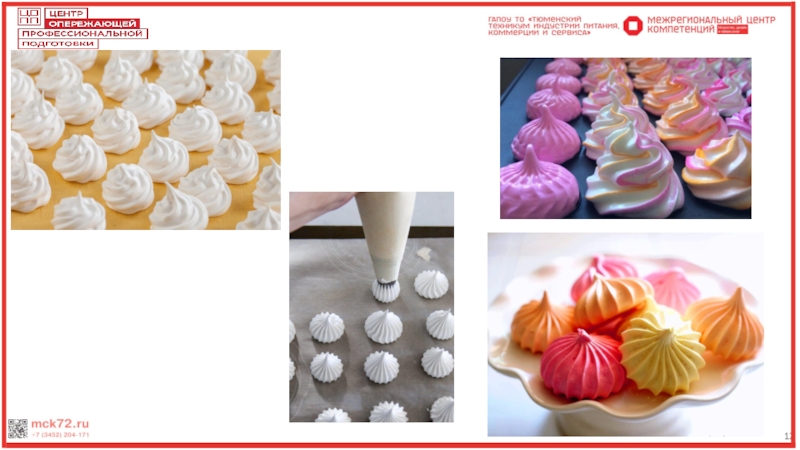 12Виды меренгФранцузская меренгаИспользуется для приготовления безе – выпеченного полуфабриката. Готовится из белкового крема сырцовым способом. Взбивают в