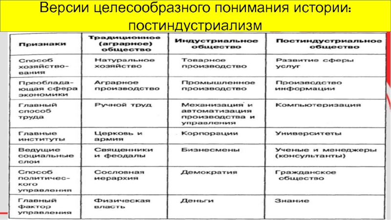 Слайд 11Версии целесообразного понимания истории: постиндустриализм