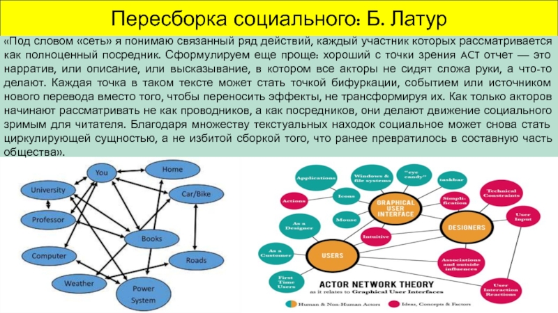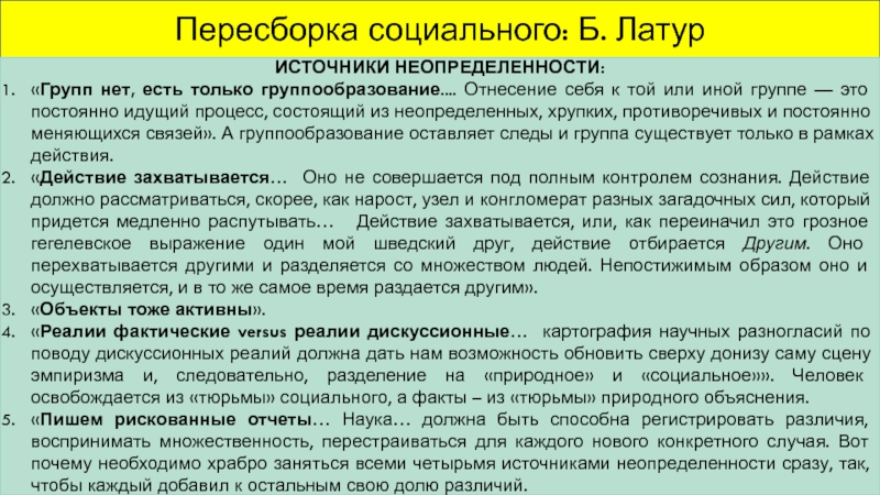 «Реалии фактические versus реалии дискуссионные… картография научных разногласий по поводу дискуссионных реалий должна дать нам возможность обновить сверху донизу саму сцену эмпиризма и, следовательно, разделение на «природное» и «социальное»». Человек освобождается из «тюрьмы» социального, а факты – из «тюрьмы» природного объяснения.