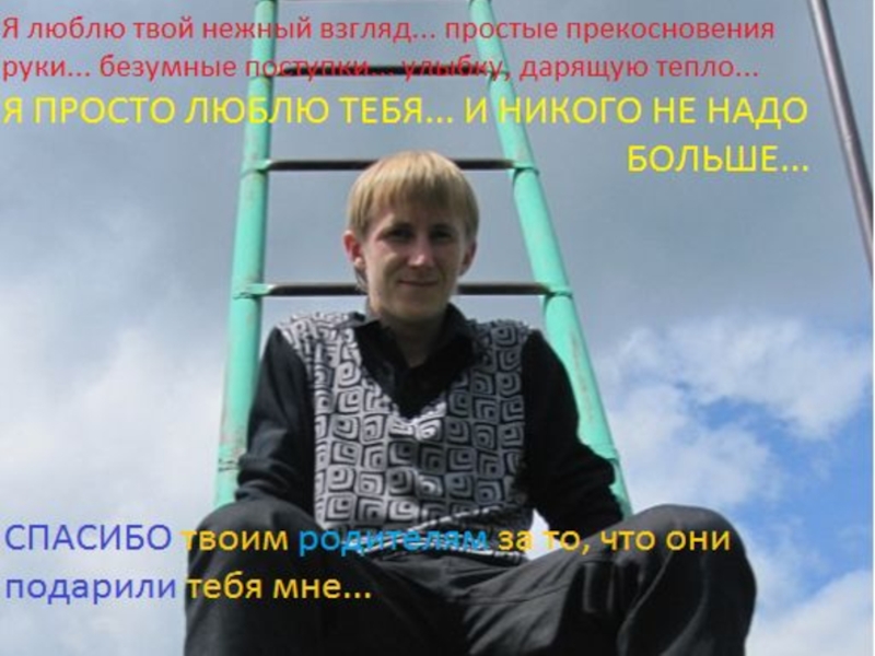 твоим присутствием, ценю все, что было между нами. Я никогда не жалела о своем выборе! Порой временами и ты, и я причиняли друг другу боль, но не смотря ни на что, мы стали только сильнее. Знаешь, иногда так хочется выбежать на улицу и кричать, что люблю тебя и желаю! Я очень сильно тебя люблю… ты есть смысл моего существования на этом свете*)