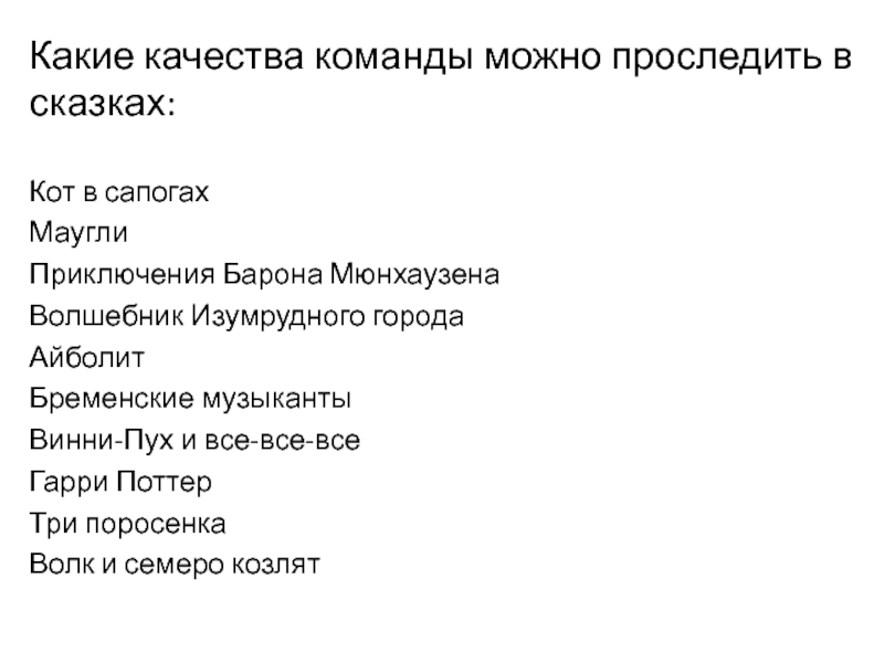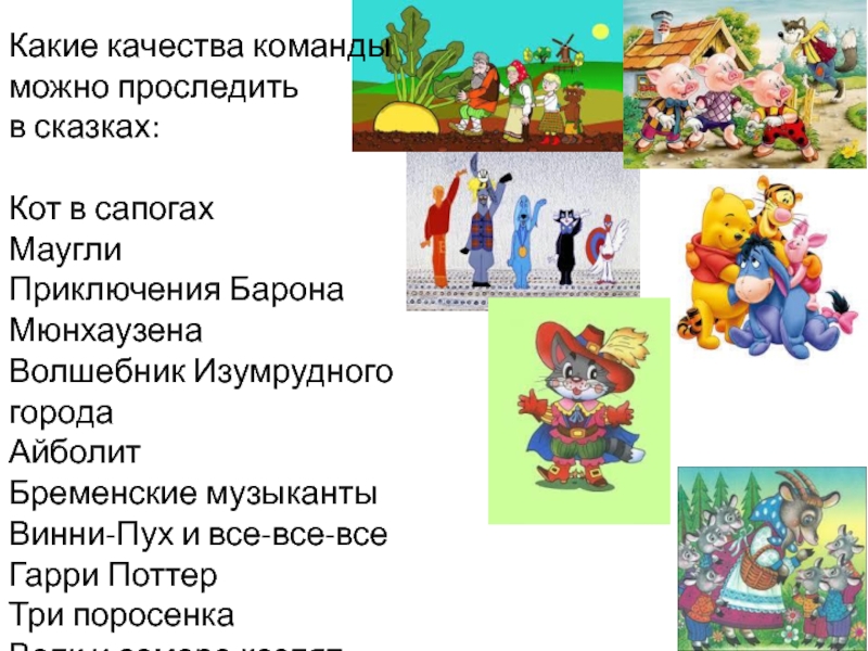 Какие качества команды можно проследить в сказках:Кот в сапогахМауглиПриключения Барона МюнхаузенаВолшебник Изумрудного городаАйболитБременские музыкантыВинни-Пух и все-все-всеГарри ПоттерТри поросенкаВолк и семеро козлят