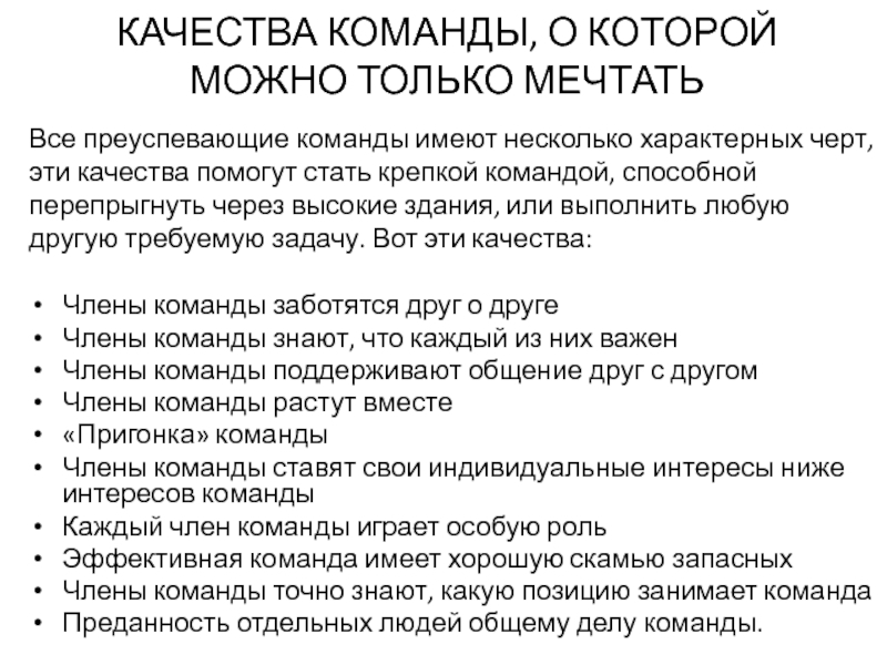 Слайд 5КАЧЕСТВА КОМАНДЫ, О КОТОРОЙ МОЖНО ТОЛЬКО МЕЧТАТЬ