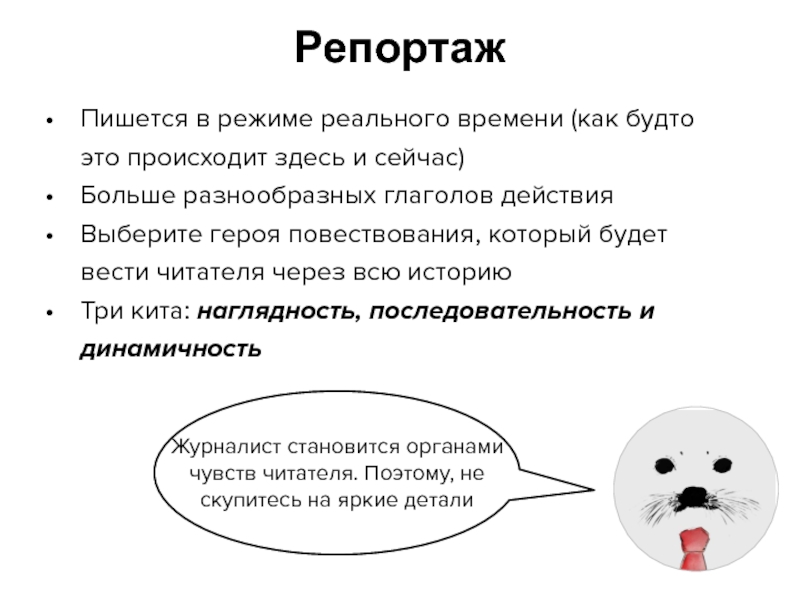 Журналист становится органами чувств читателя. Поэтому, не скупитесь на яркие детали