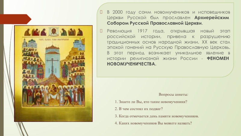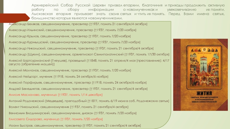 Архиерейский Собор Русской Церкви призвал епархии, благочиния и приходы продолжить активную работу по сбору информации о новомучениках и увековечиванию их памяти. Лысковская епархия призывает знать своих святых и чтить их память. Перед Вами имена святых, большинство которых являются новомученниками.