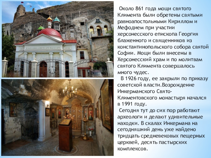 Слайд 19 Около 861 года мощи святого Климента были обретены святыми