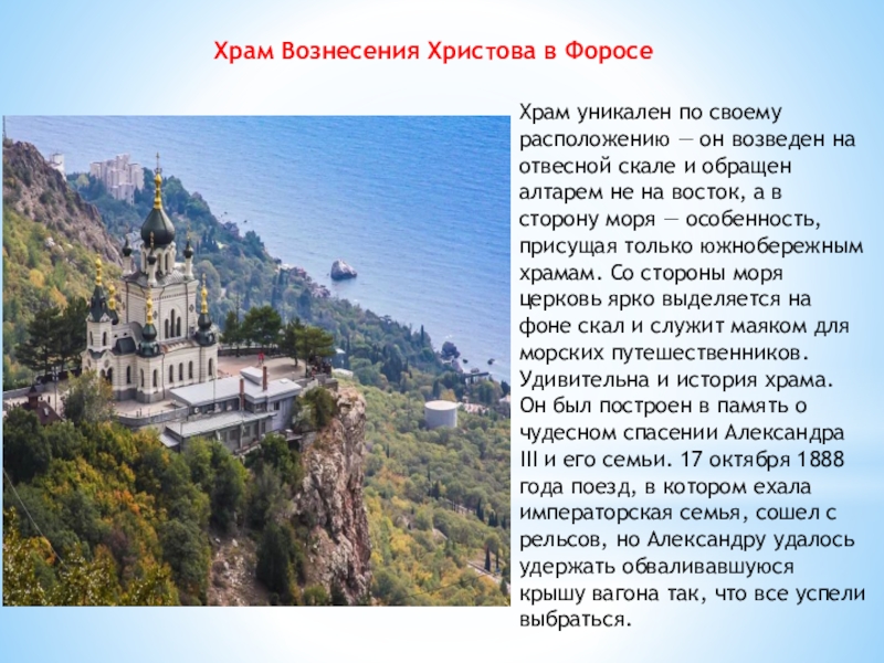 восток, а в сторону моря — особенность, присущая только южнобережным храмам. Со стороны моря церковь ярко выделяется на фоне скал и служит маяком для морских путешественников.