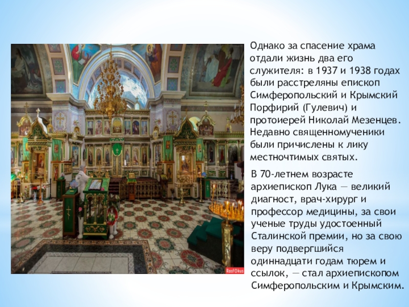 Крымском полуострове, стал кафедральным собором Симферополя и получил широкую известность благодаря служившему здесь в последние 15 лет своей жизни святителю Луке (Войно-Ясенецкому).