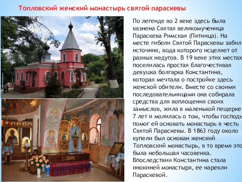 вода которого исцеляет от разных недугов. В 19 веке этих местах поселилась простая благочестивая девушка болгарка Константина, которая мечтала о постройке здесь женской обители. Вместе со своими последовательницами она собирала средства для воплощения своих замыслов, жила в маленькой пещерке 7 лет и молилась о том, чтобы господь помог ей основать монастырь в честь Святой Параскевы. В 1863 году около купели был основан женский Топловский монастырь, в то время это была небольшая часовенка. Впоследствии Константина стала инокиней монастыря, ее нарекли Параскевой.