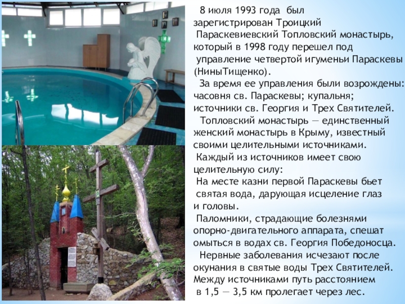 были возрождены: часовня св. Параскевы; купальня; источники св. Георгия и Трех Святителей.