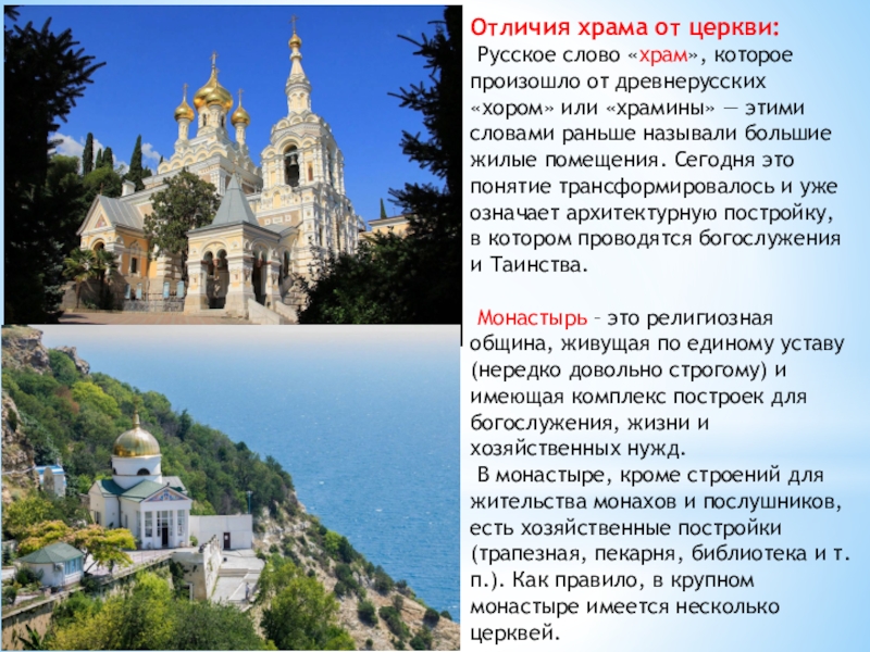 Монастырь – это религиозная община, живущая по единому уставу (нередко довольно строгому) и имеющая комплекс построек для богослужения, жизни и хозяйственных нужд.