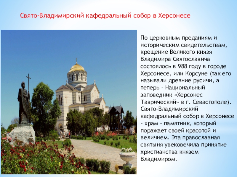 городе Херсонесе, или Корсуне (так его называли древние русичи, а теперь – Национальный заповедник «Херсонес Таврический» в г. Севастополе). Свято-Владимирский кафедральный собор в Херсонесе – храм – памятник, который поражает своей красотой и величием. Эта православная святыня увековечила принятие христианства князем Владимиром.