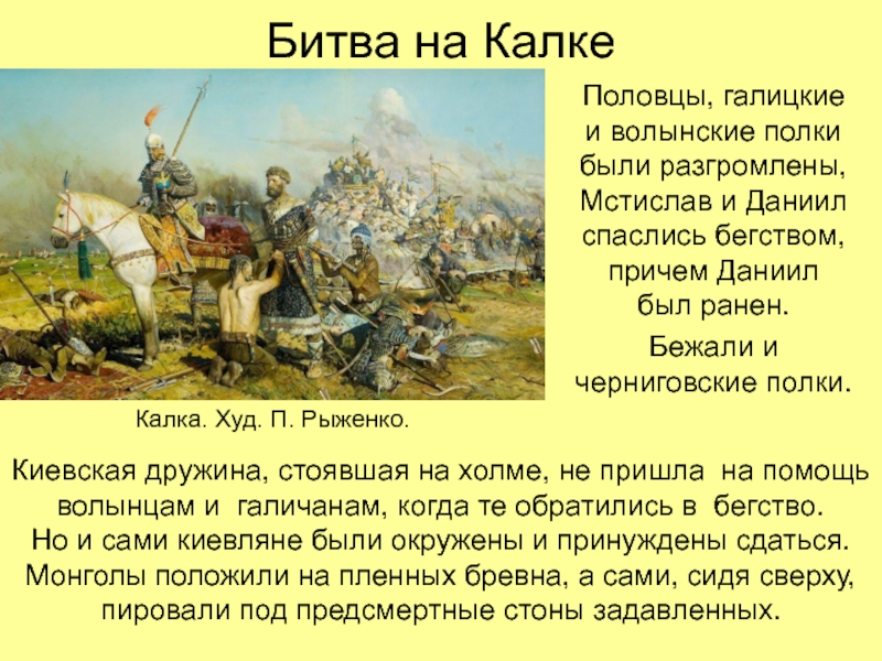 Киевская дружина, стоявшая на холме, не пришла на помощь волынцам и галичанам, когда те обратились в бегство.