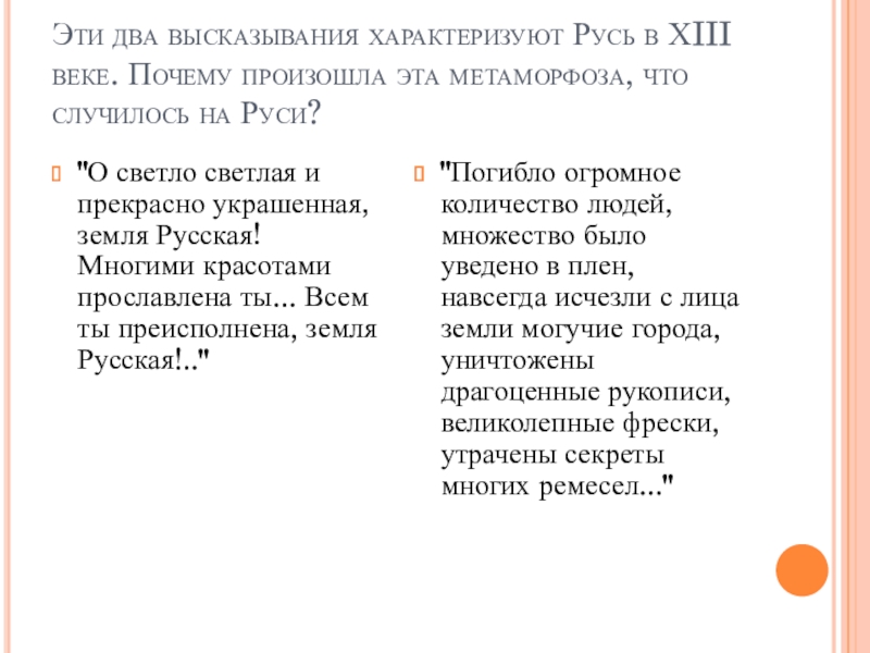 украшенная, земля Русская! Многими красотами прославлена ты... Всем ты преисполнена, земля Русская!..""Погибло огромное количество людей, множество было уведено в плен, навсегда исчезли с лица земли могучие города, уничтожены драгоценные рукописи, великолепные фрески, утрачены секреты многих ремесел..."