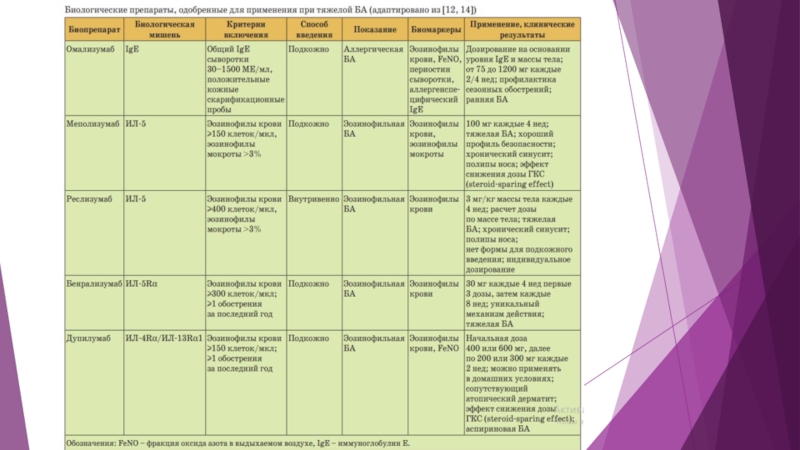 Дупилумаб одобрен FDA и EMA в 2018 г. для применения в качестве препарата дополнительной поддерживающей терапии у пациентов в возрасте 12 лет и старше с тяжелой БА, сопровождающейся воспалительной реакцией 2-го типа