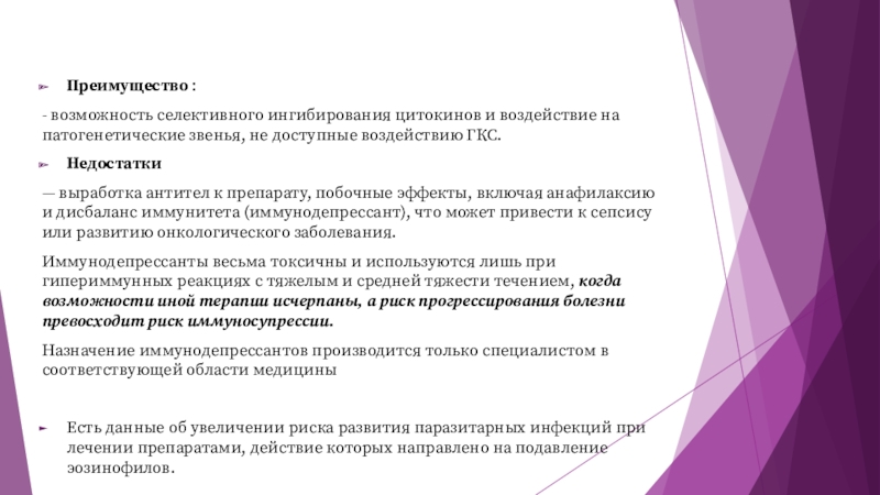 - возможность селективного ингибирования цитокинов и воздействие на патогенетические