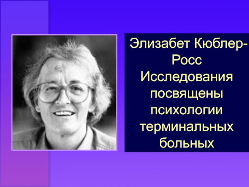 Слайд 19Элизабет Кюблер-Росс Исследования посвящены психологии терминальных больных