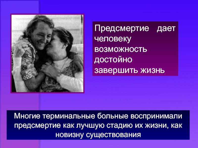 Слайд 21Предсмертие дает человеку возможность достойно завершить жизнь