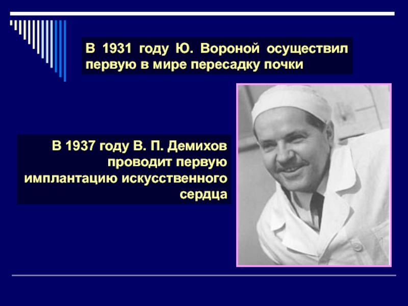 Слайд 29В 1931 году Ю. Вороной осуществил первую в мире пересадку