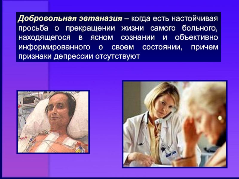 Слайд 8Добровольная эвтаназия – когда есть настойчивая просьба о прекращении жизни