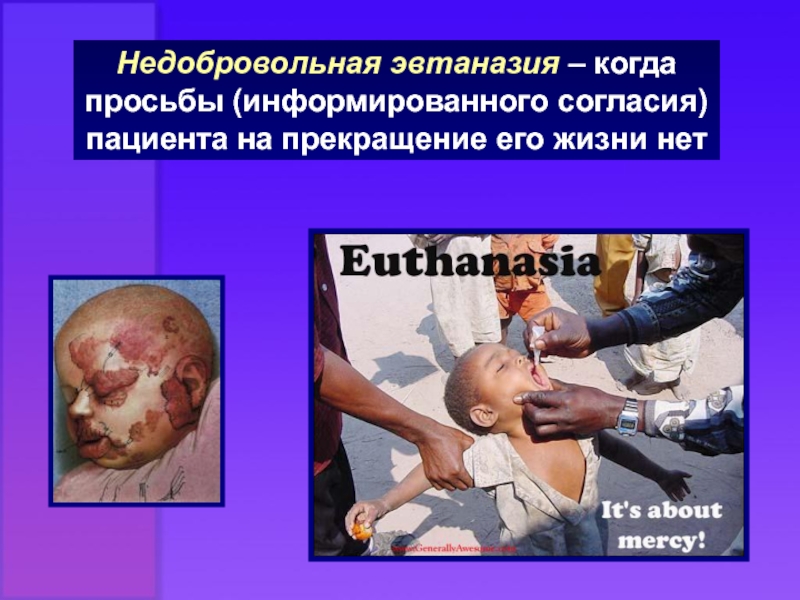 Слайд 9Недобровольная эвтаназия – когда просьбы (информированного согласия) пациента на прекращение