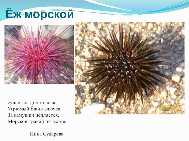Ёж морскойЖивет на дне колючка - Угрюмый Ёжик-злючка. За камушки цепляется, Морской травой питается.