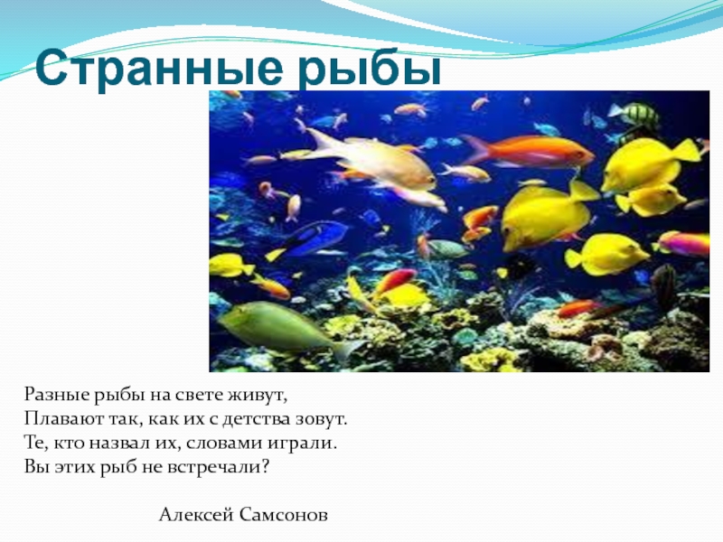 Странные рыбыРазные рыбы на свете живут, Плавают так, как их с детства зовут. Те, кто назвал их,