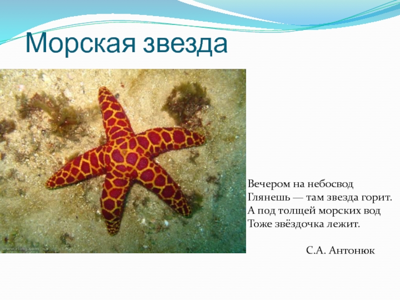 Морская звездаВечером на небосвод Глянешь — там звезда горит. А под толщей морских вод Тоже звёздочка лежит.