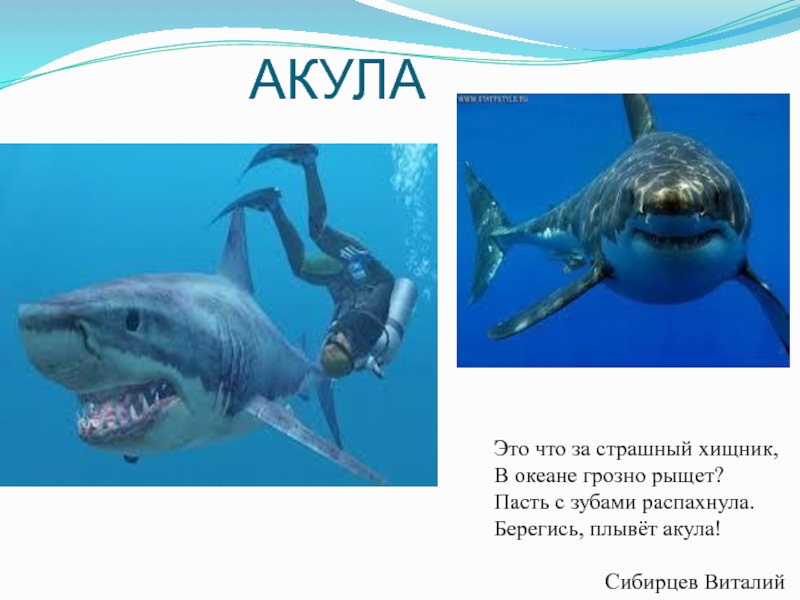 АКУЛАЭто что за страшный хищник, В океане грозно рыщет? Пасть с зубами распахнула. Берегись, плывёт акула!