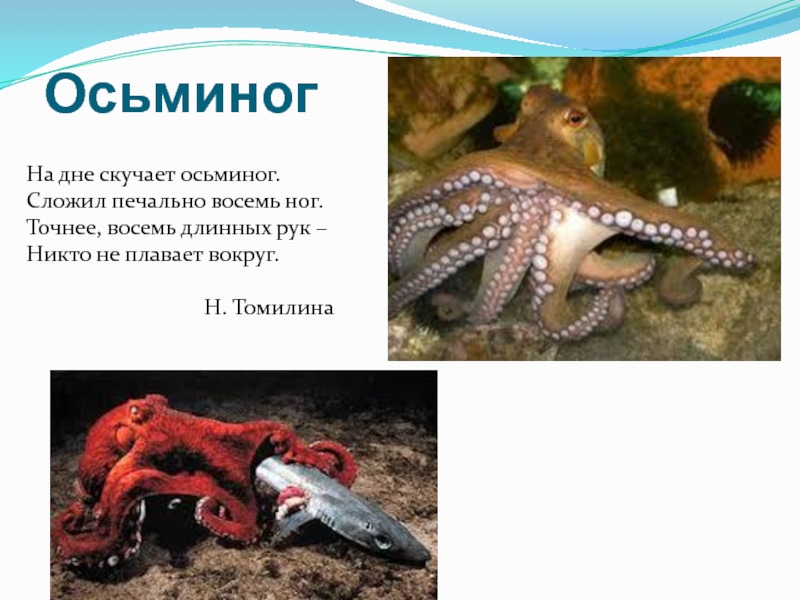 На дне скучает осьминог. Сложил печально восемь ног. Точнее, восемь длинных рук