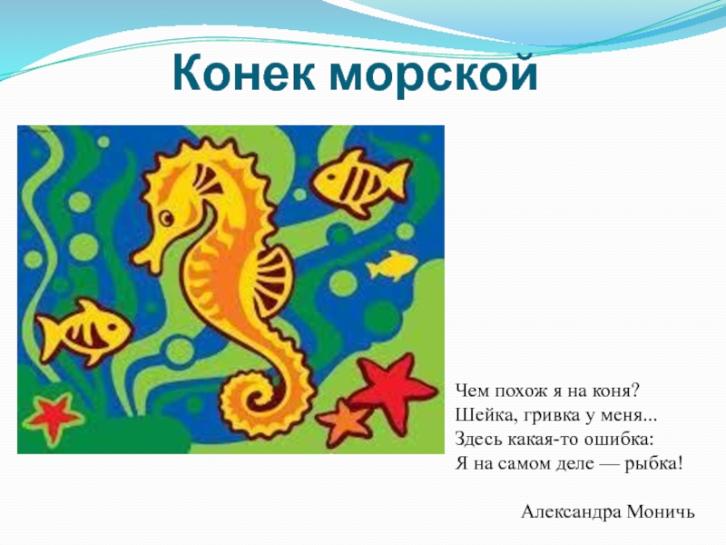 Конек морскойЧем похож я на коня? Шейка, гривка у меня...  Здесь какая-то ошибка:  Я на