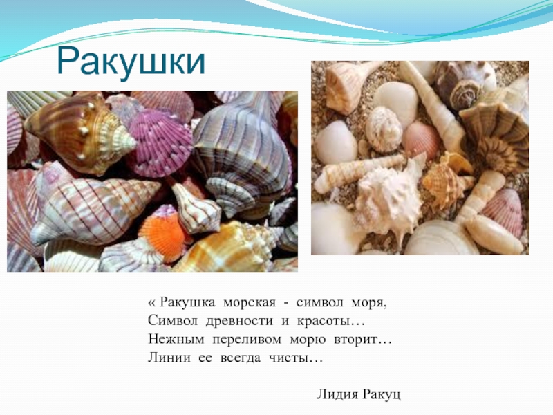 Ракушки« Ракушка  морская  -  символ  моря, Символ  древности  и  красоты… Нежным  переливом  морю  вторит… Линии  ее  всегда