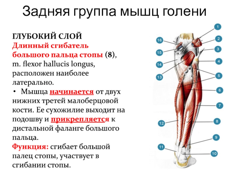 Функция: сгибает большой палец стопы, участвует в сгибании стопы.
