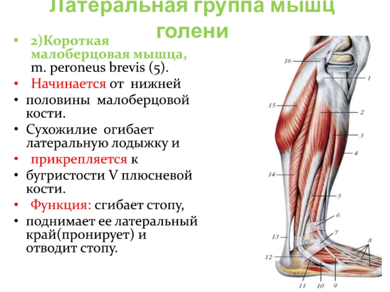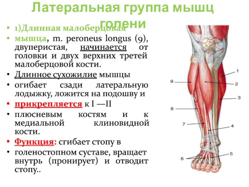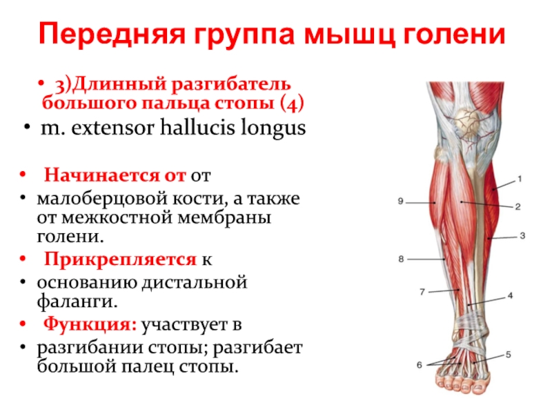 нижних третей малоберцовой кости. Ее сухожилие выходит на подошву и прикрепляется к дистальной фаланге большого пальца.
