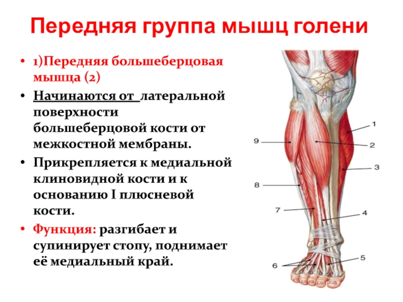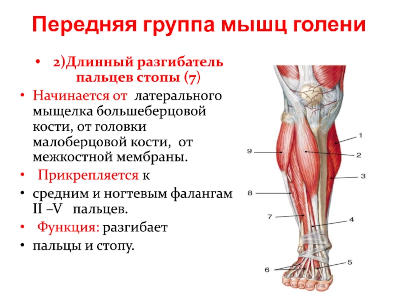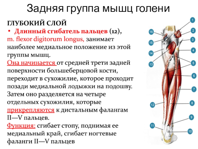 Функция: сгибает стопу, поднимая ее медиальный край, сгибает ногтевые фаланги II—V пальцев